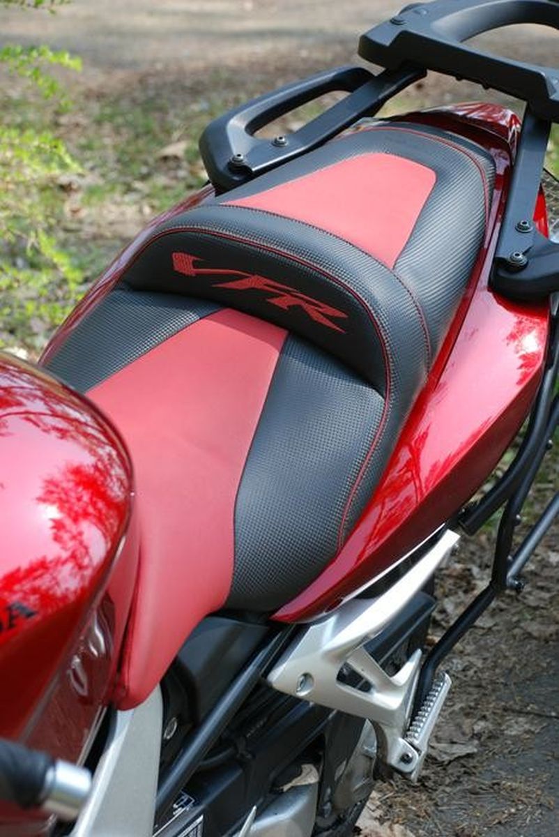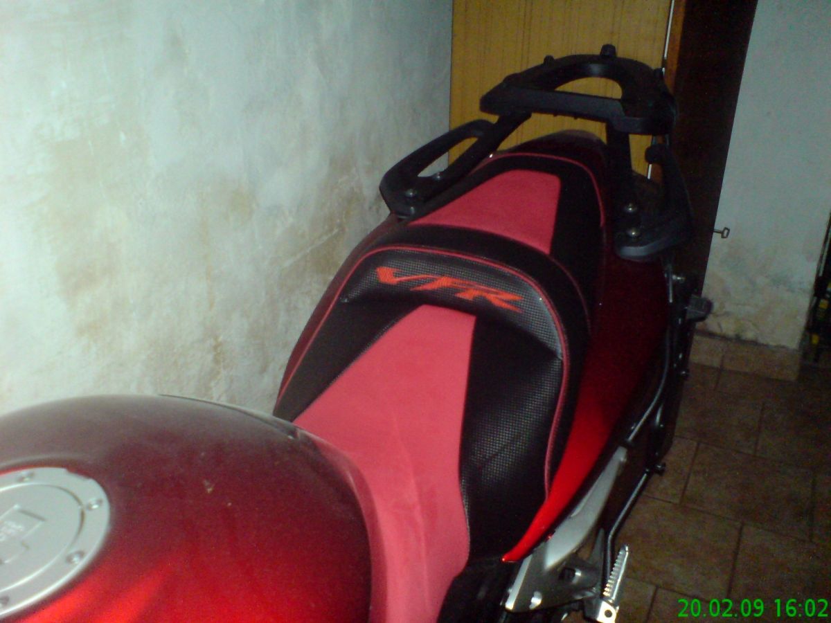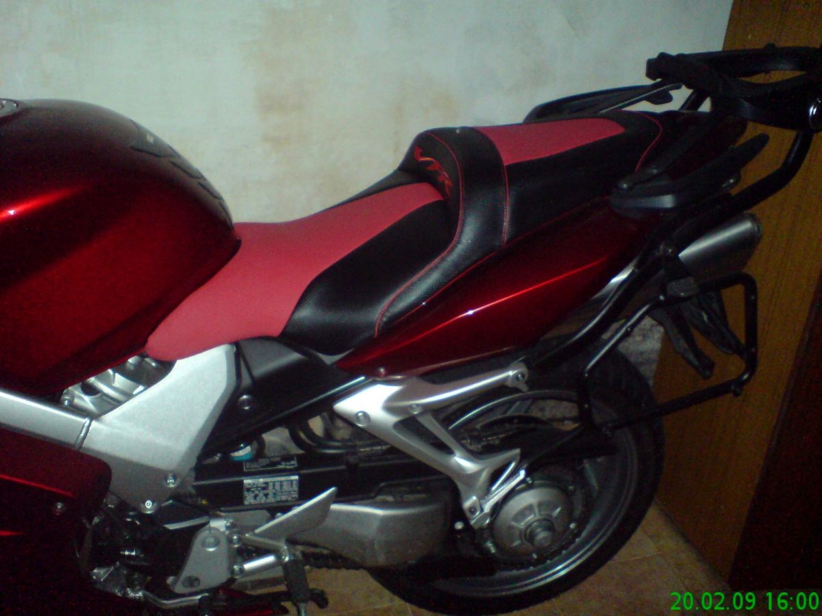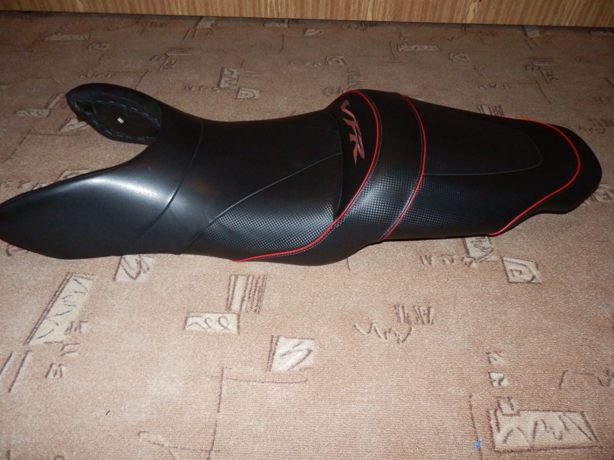 Jak už to tak bývá nápadů byla spousta, finance omezené, ale "když ji miluješ, není co řešit". Jedna z věcí do kterých jsem se rozhodnul jít bylo prošívané sedlo. Těch cca 8 let zpátky to u nás v republice nebylo rozhodně nic častého a tak i možnost výběru dodavatele byla značně omezená. Jako nejlepší volba mi vyšlo sedlo Bagster. Především protože na ně byly nějaké recenze a co jsem uvítal byla možnost jej objednat přes prodejce HZmoto z Nových domků u Jihlavy, tedy nedaleko od nás. Nejprve jsem začal shánět druhé sedlo, protože originál jsem si chtěl ponechat netknutý. To se zadařilo za mrzký peníz s tím, že u řidiče bylo o 3 cm vybrané. S tímto sedle jsem oslovil pana Hlouška z HZ a začli jsme se domlouvat jak vše proběhne. Takže v první řadě design. Za druhé výška a délka plochy pro jezdce/ spolujezdce. Zde je mám pocit možnost úpravy v rozmezí +-2cm snad všemi směry. Další možnost je volba gelu. Vzhledem k tomu, že vlastním výroční model a ten je barevně poměrně divoký něchtěl jsem se sedlem přestřelit a dlouze zkoušel různé kombinace. Prodejce mi nabídnul ať si půjčím kompletní vzorník na víkend domů což jsem samozřejmě využil. Po dlouhém rozmýšlení a upravování v garfických programech bylo jasné, že chci něco decentního, nebarevného, protože to už by bylo na danou motorku moc. I dnes jsem s volbou spokojen a nevolil bych zřejmě jinak. Původní výšku jsem nechal upravit na standartní , gel jsem nakonec neobjednal. Dodání sedla bylo po 6 týdnech od objednání tak jak bylo slíbeno. Dosud má sedlo za sebou 7 sezon a cca 80t.km. Nikde nevykazuje žádné opotřebení. Snad jen prošívaný nápis VFR už je trochu ztmavlý, ale zřejmě by to napravila nějaká pěna na čistění čalounění. Co se týče pohodlí tak je určitě příjemnější než originál. Spolujezdec ani při prudším brždění nesjiždí na řidiče. Polstrování-tuhost od Bagsteru je pro mě osobně tak akorát. Ani tvrdé ani měkké. Je možná o něco poddajnější než originál, ale ne mekké, což nemám rád. Tisíc km za den se na něm dá zvládnout, ale rozhodně to není nějaká pohodička -což je dáno ale spíš motorkou než sedlem samotným. Zkrátka na sedlo samotné si nelze stěžovat ani při cestování ani při sportovnějším zacházení.