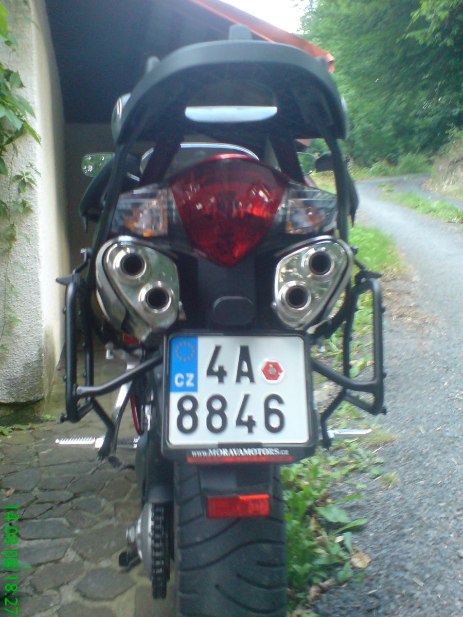 integrální helma. Na fi jsem si vyrobil hliníkové kufry s otevíráním víka a tento systém je dle mně nejlepší. Zase se designově takové kufry moc nehodí na moto tohohle typu. Boční kufry jsem ani nechtěl kupovat, protože jezdím sám. A tam mi přijde ideální kombinace zadního kufru a válce na zadní sedlo.