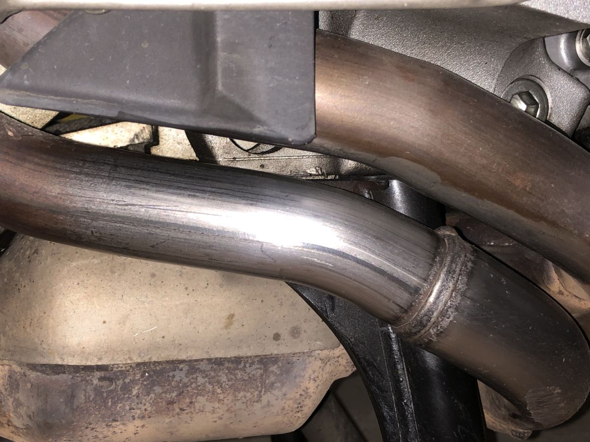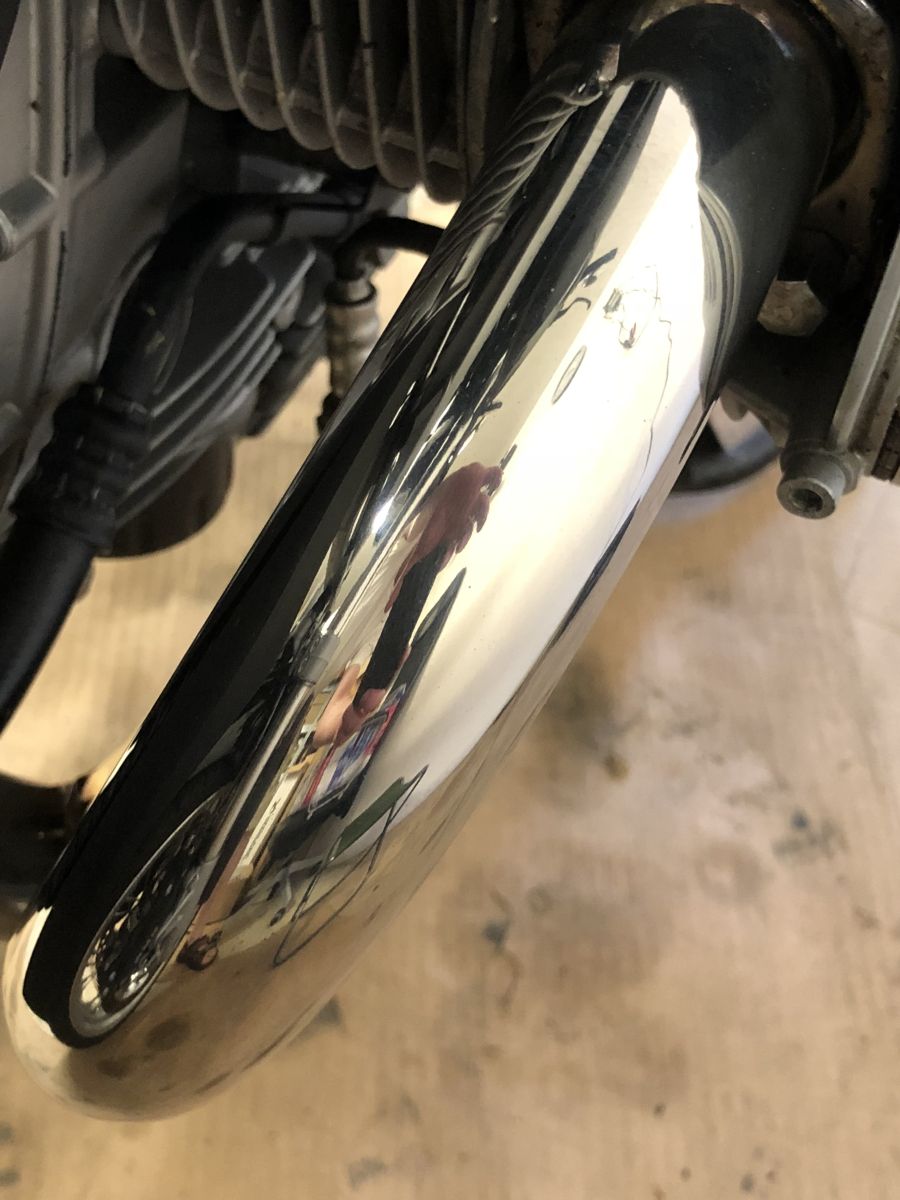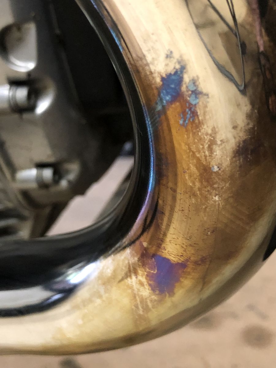 Začal jsem na bavoráku. Najeto 16 tis. km, svody nikdy nikdo nečistil. Modrá přechází do zlatavé a ta postupně přejde do původní stříbřitě chromové. Poťapám výfuk, nechám chvíli působit, setřu a – nic. Na jednom místě takový nepatrný flíček, jak prosvítá chrom, ale jinak původní stav. Beru tedy znovu houbičku a dvě minuty leštím jedno místo. Stříbřitá plocha se zvětšila. Takže „napojím“ houbičku přípravkem a leštím celé koleno. Konečně je vidět výsledek. Možná leštička s kotoučem by to zvládly rychleji. Takto mi jedno koleno trvá zhruba 45 minut. Problém je právě v tom zbarvení. Zhruba po patnácti minutách už byl svod celý stříbrný, ale lokálně na něm zůstávaly zlatavé fleky. Zhruba půlhodinu zabralo jejich odstranění. Vyčištěné svody jsem ještě přeleštil Metal polishem, ale to už je jenom taková kosmetika na závěr.