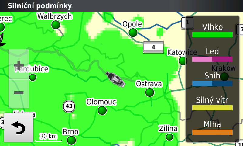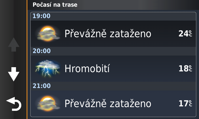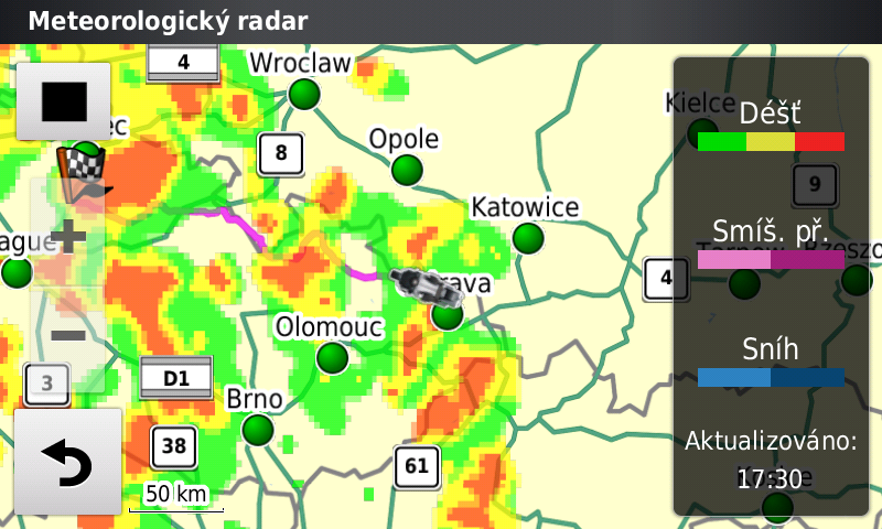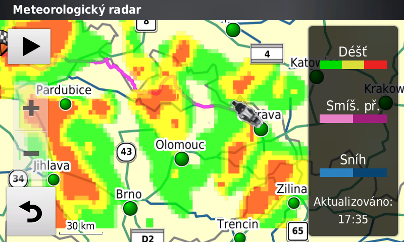 Rozšířená služba počasí je za malý, jednorázový poplatek. Varování před námrazou asi nebude úplně to pravé pro motorkáře, ale třeba silný vítr nebo intenzivní srážky ano. Srážky je také možné zobrazit ve formě animovaných radarových dat na displeji. Kvalita zobrazení odpovídá počasí na www.weather.com, což je pro uživatele radaru CHMI zklamáním.