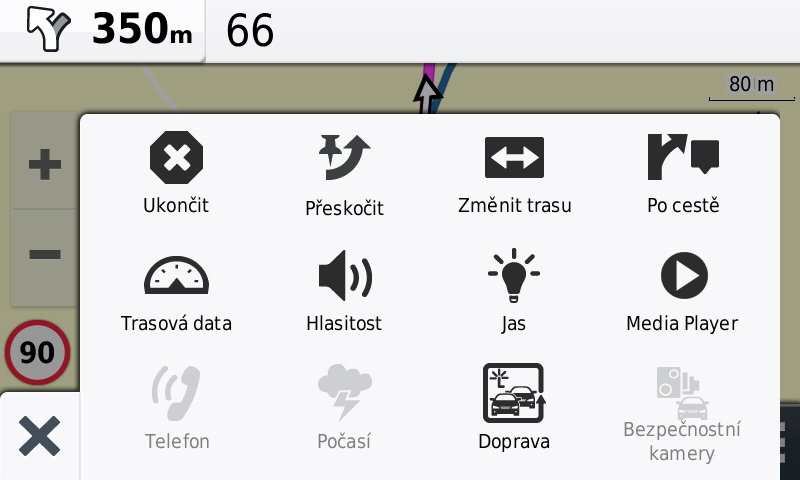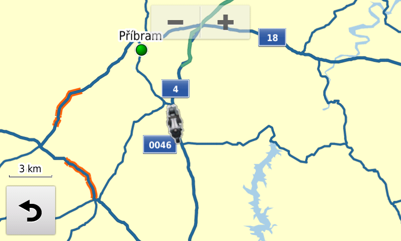 Další den, další pokus. Do trasy z předešlého dne dávám několik nesmyslných shaping points mimo trasu. Změna waypoint/shaping point není složitá. V PC je to vlastně jen kliknutí myší. V navigaci tapnutí prstem. První shaping point zkouším přeskočit i za jízdy. Menu/skip. Funguje to. Snadno přístupné, snadno zruším bod, kam nechci jet. Odbočku k dalšímu bodu záměrně míjím. Navigace přepočte trasu s odbočením na nejbližší křižovatce, kterou také záměrně míjím. Navigace neprudí, přepočte trasu a nechává bod za námi. Takhle chci, aby se to chovalo.