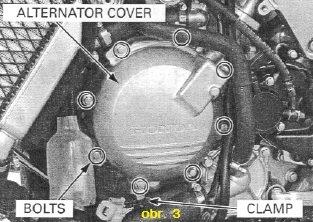 Zde stačí postupovat dle servisního manuálu, pokud jej máte. Ve zkratce je potřeba sundat levou kapotu, demontovat nádobku na chladicí kapalinu, není nutno vypouštět, stačí pověsit na levé řidítko. Rozpojit kabely vedoucí přes víko alternátoru, popř. vyhnout nějaké hadice pokud zavazejí (obr. 3). Připravte si nějakou misku a hadru, vyteče trochu motorového oleje (asi půl deci). Povolte šrouby víka. Víko bude pravděpodobně dobře držet na těsnění, lehce jsem zkusil zapáčit šroubovákem, jestli neodskočí, ale ani se nepohnulo v mém případě. Více síly jsem zkoušet nechtěl je to hliník a nechtěl bych poškodit víko. Zkusil jsem poklepávat dřevěnou stranou kladiva. Chce to asi trpělivost, nemusel jsem bouchat moc a po asi dvou minutách opatrného poklepávání samo hezky odskočilo. Následně můžete již nyní očistit víko i blok motoru od starého papírového těsnění.